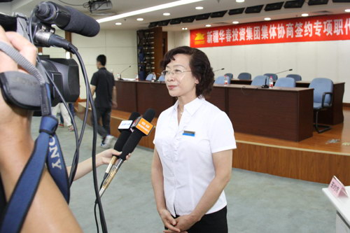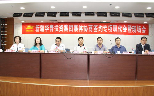 6月15日上午,對于新疆華春投資集團全員來說,是個神圣的日子,在我們偉大的中國共產黨成立90周年的前夕,在全社會著力構建和諧、改善民生的關鍵時刻,作為高新區(qū)(新市區(qū))簽訂三項集體合同的重點示范企業(yè)新疆華春投資集團集體協(xié)商簽約專項職代會暨現(xiàn)場會,在高新區(qū)管委會5樓多功能廳隆重舉行!自治區(qū)總工會、烏魯木齊市總工會和高新區(qū)(新市區(qū))區(qū)委領導出席會議,高新區(qū)(新市區(qū))轄區(qū)內各主要企業(yè)派代表前來觀摩,共同見證了受華春投資集團法定代表人委托的企業(yè)方代表周躍江先生和職工方的代表華春投資集團工會主席高青同志,簽訂“三項合同”即《集體合同》、《工資集體協(xié)議合同》和《女職工權益保護專項集體合同》。