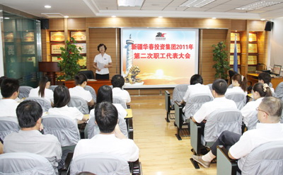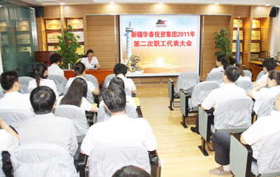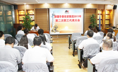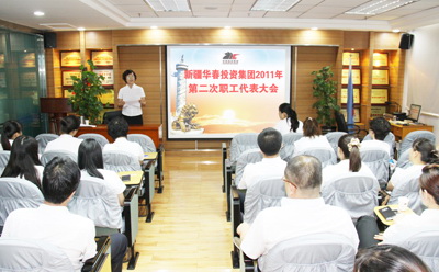 新疆華春投資集團(tuán)有限公司2011年第二次職工代表大會(huì)于7月30日上午在新疆華春投資集團(tuán)子公司新疆恒潤(rùn)實(shí)業(yè)有限公司培訓(xùn)室召開(kāi),會(huì)議由高青同志主持。參加會(huì)議的應(yīng)到職工代表51人,實(shí)到職工代表 49人。
