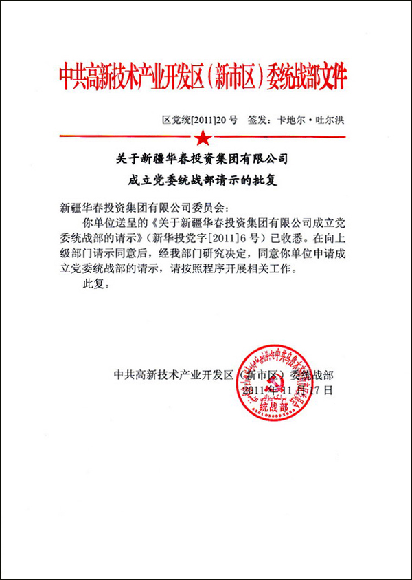 11月17日下午,新疆華春投資集團(tuán)黨委書記嚴(yán)天利,懷著激動(dòng)的心情從高新區(qū)(新市區(qū))委統(tǒng)戰(zhàn)部接過(guò)批復(fù),同意華春集團(tuán)成立黨委統(tǒng)戰(zhàn)部,請(qǐng)按照秩序開展相關(guān)工作,至此,標(biāo)志著非公有制企業(yè)統(tǒng)戰(zhàn)工作全面開始。