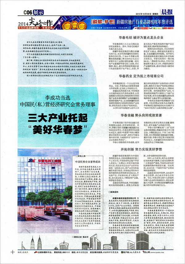 10月30日的《晨報》于C06版用整版篇幅,以“李成功當(dāng)選中國民(私)營經(jīng)濟研究會常務(wù)理事,三大產(chǎn)業(yè)托起美好華春夢”為題,對華春大業(yè)進行了專題報道。