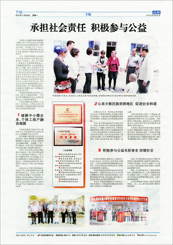 華春集團,以創(chuàng)造更多財富讓更多人分享的崇高使命和強烈的社會責任感,得到各級黨政和社會各界的首肯。本周,晨報以《承擔社會責任 積極參與公益》為題,又用一個整版對華春的善舉進行了大篇幅的報道。
