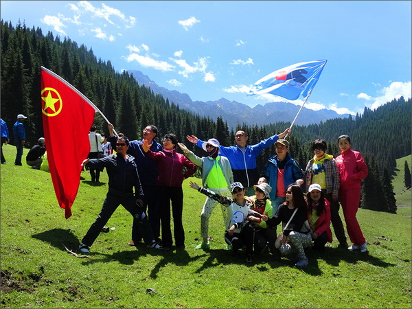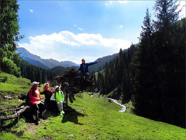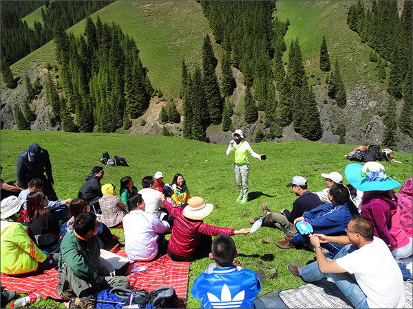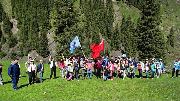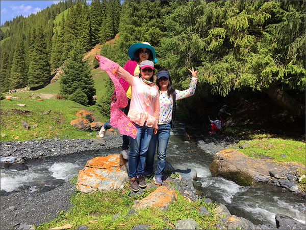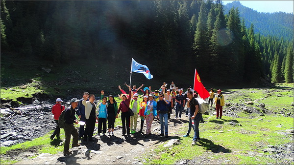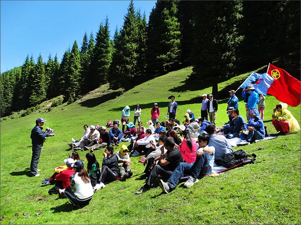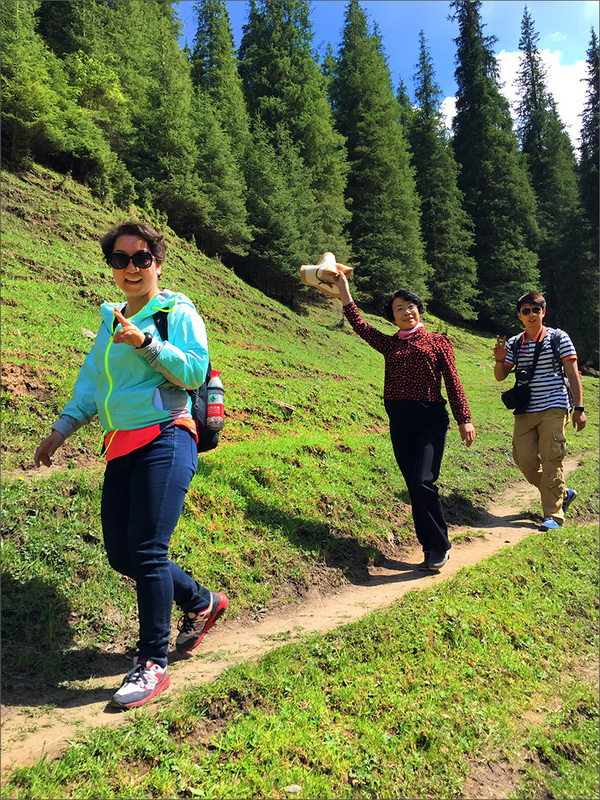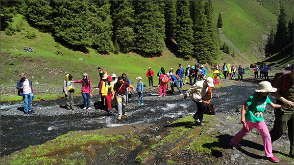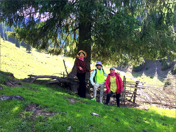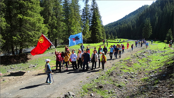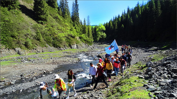 從喧囂的都市來(lái)到南山群山中風(fēng)景優(yōu)美的溝谷之一沙溝,這個(gè)位于北天山支脈北麓的山區(qū),集中的展現(xiàn)著大美新疆的妙景。深邃的峽谷,蒼翠欲滴,在重峰疊嶂、唯有山羊才能攀巖上去的危崖聳立之處,一條蜿蜒的山道出其不意在期待著我們的步伐,眼前豁然開闊。在如茵的草坡,山花吐艷。白色的氈房點(diǎn)綴著一派綠色美景,不由得想起一句歌詞:氈房好似珍珠撒。盡管當(dāng)今已難免的染上了一抹市場(chǎng)經(jīng)濟(jì)的色彩,但當(dāng)哈薩克牧民的羊群從我們徒步隊(duì)伍中穿過(guò)時(shí),立馬提醒著后人,這個(gè)俊美的山區(qū)從唐代就曾是著名的牧區(qū)狩獵區(qū),霎時(shí)有一種在時(shí)空中穿梭的感覺。