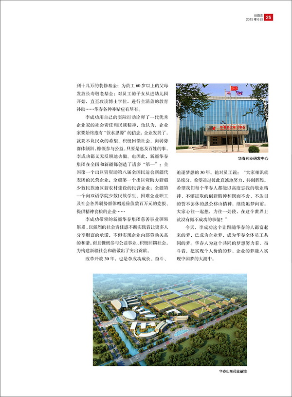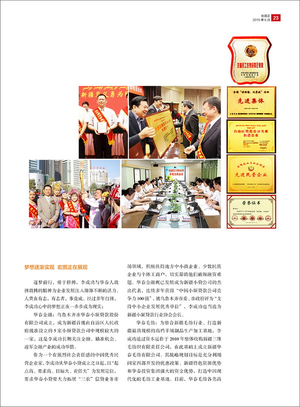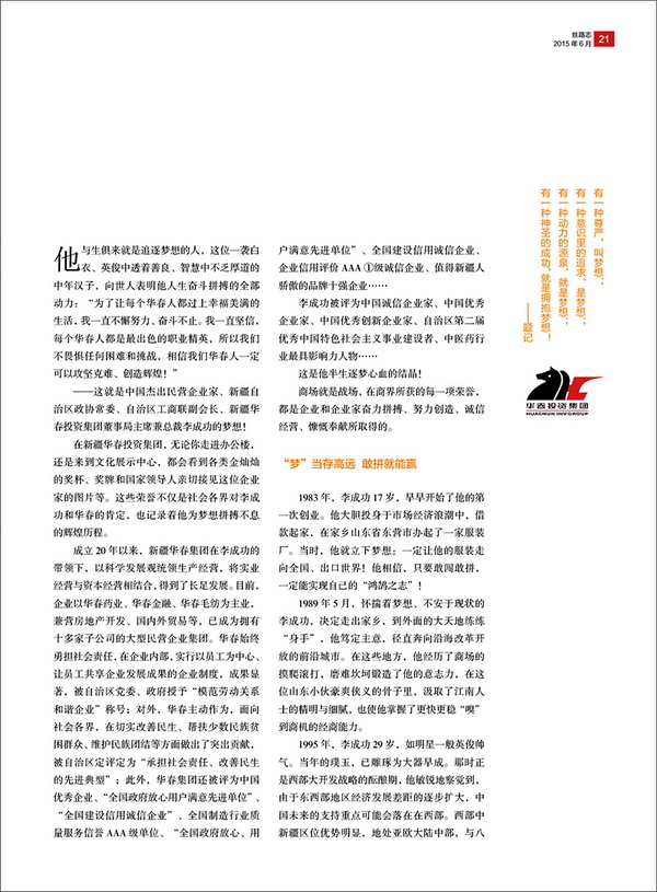 新疆華春投資集團(tuán)董事局主席兼總裁李成功先生,榮登自治區(qū)工商聯(lián)主辦的刊物《絲路志》封面人物,并同期刊登了報告文學(xué)《以夢想引領(lǐng)的恢弘成功》。