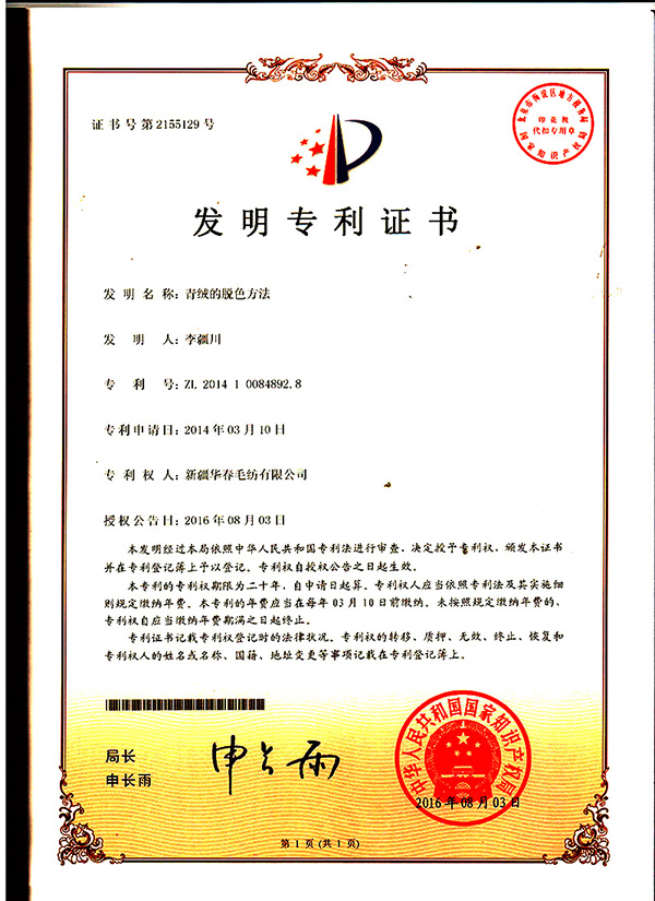 近日,經(jīng)國家知識產(chǎn)權(quán)局評審,新疆華春毛紡有限公司申請的“青絨的脫色方法”技術(shù)創(chuàng)新成果,喜獲國家發(fā)明專利,專利號為 ZL 201410084892.8。