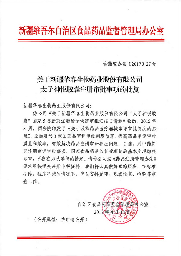 日前,自治區(qū)藥監(jiān)局對(duì)新疆華春生物藥業(yè)股份有限公司關(guān)于抗抑郁新藥太子神悅膠囊注冊(cè)審批事項(xiàng)作出批復(fù):國(guó)家食品藥品監(jiān)督管理總局基本實(shí)現(xiàn)即報(bào)即審,不存在排隊(duì)等待的情形。請(qǐng)你公司按《藥品注冊(cè)管理辦法》要求盡快提交注冊(cè)申報(bào)資料,我們將認(rèn)真做好跟蹤服務(wù),在標(biāo)準(zhǔn)不降,程序不減的情況下,優(yōu)先安排受理、現(xiàn)場(chǎng)檢查、檢驗(yàn)等審查工作。
