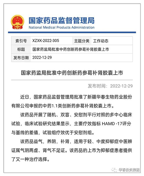 2022年12月29日,這是全疆全國醫(yī)藥界值得慶賀的重大喜慶日子!新疆華春生物藥業(yè)股份有限公司(以下簡稱:華春藥業(yè))向國家藥監(jiān)局申報的國家十三五“國家重大新藥創(chuàng)制·科技重大專項”抗抑郁癥 1.1類中藥創(chuàng)新藥“參葛補腎膠囊”獲批上市!這是全國醫(yī)藥界可喜可賀的盛事!更是新疆醫(yī)藥界國家1類創(chuàng)新藥!開創(chuàng)了新疆擁有國家1類創(chuàng)新藥的新紀(jì)元!