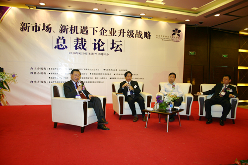 圖為:香港理工大學(xué)院長高級顧問曾慶忠在論壇上主持由新疆華春投資集團(tuán)有限公司董事局主席兼總裁李成功、西子聯(lián)合控股有限公司董事長王水福、賽維LDK太陽能有限公司董事長兼總裁彭小峰參加的《強(qiáng)強(qiáng)合作企業(yè)騰飛戰(zhàn)略》專題討論。