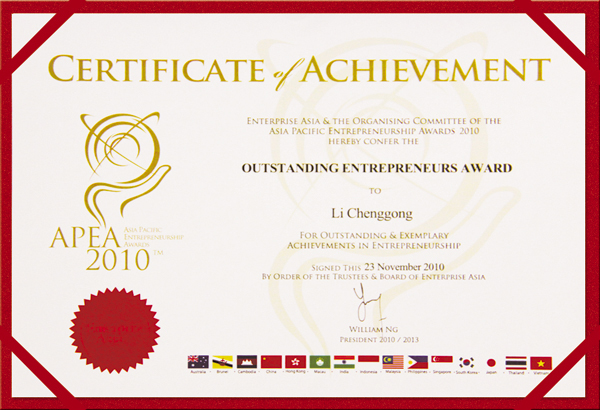 亞太企業(yè)精神獎(jiǎng)(APEA),即對(duì)亞太區(qū)域內(nèi)在建立成功企業(yè)過程中,以堅(jiān)毅精神取得卓越成就、并注重企業(yè)社會(huì)責(zé)任企業(yè)家們給予的最高獎(jiǎng)項(xiàng)。此項(xiàng)評(píng)選活動(dòng)由亞洲企業(yè)商會(huì)組織主辦,獲得各國企業(yè)、商會(huì)及政府的支持,在亞洲印度、新加坡、馬來西亞、中國香港、印度尼西亞、文萊、越南、孟加拉國、泰國和中國等10個(gè)國家和地區(qū)進(jìn)行評(píng)選,致力于表彰全亞洲企業(yè)家中的精英,激勵(lì)更多創(chuàng)新,承擔(dān)社會(huì)責(zé)任,弘揚(yáng)企業(yè)精神。