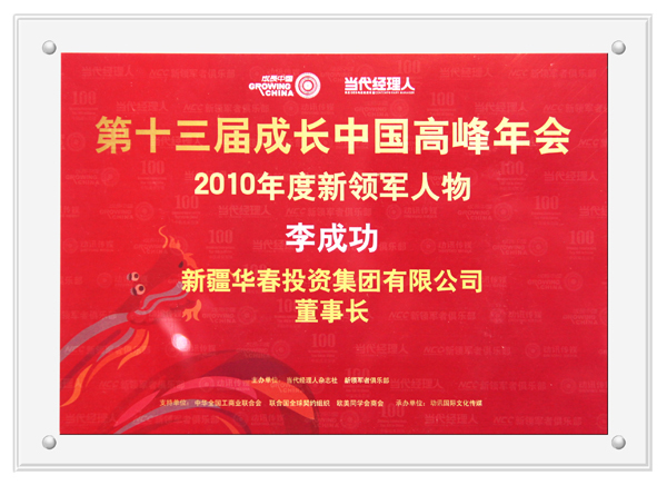 由《當(dāng)代經(jīng)理人》雜志社和新領(lǐng)軍者俱樂部主辦、全國工商聯(lián)、歐美同學(xué)會商會、聯(lián)合國全球契約組織等聯(lián)合協(xié)辦的第十三屆成長中國高峰年會暨2010中國成長百強頒獎盛典,于12月4日~5日在北京隆重舉行,新疆華春投資集團入選“2010中國成長百強”前25名、董事長兼總裁李成功先生榮獲“2010年度新領(lǐng)軍人物”稱號。