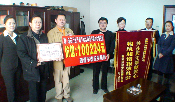 新疆華春投資集團(tuán)為以實(shí)際行動(dòng)落實(shí)黨的十七大關(guān)注民生、構(gòu)建和諧社會(huì)的精神,為使社區(qū)及時(shí)了解到黨和國(guó)家的各項(xiàng)路線(xiàn)方針政策與有關(guān)新聞信息動(dòng)態(tài),同時(shí)感受社會(huì)各界對(duì)社區(qū)的親切關(guān)注,配合烏魯木齊市萬(wàn)名干部下社區(qū)的活動(dòng),在新春佳節(jié)即將到來(lái)之際,出資10萬(wàn)余元,訂購(gòu)全年的《新疆經(jīng)濟(jì)報(bào)》348份,于2月1日贈(zèng)送到烏魯木齊市萬(wàn)名干部下社區(qū)領(lǐng)導(dǎo)小組辦公室,將黨報(bào)贈(zèng)送到市委市政府直接聯(lián)系的社區(qū),為基層社區(qū)提供精神食糧。