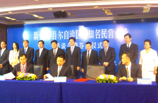 新疆維吾爾自治區(qū)與蘇寧環(huán)球集團(tuán)、東方希望、萬達(dá)集團(tuán)、四川宏達(dá)、泛海集團(tuán)、金花集團(tuán)等國內(nèi)知名民營企業(yè),進(jìn)行了總投資額達(dá)1200多億元的7個重點(diǎn)投資項目的簽約。