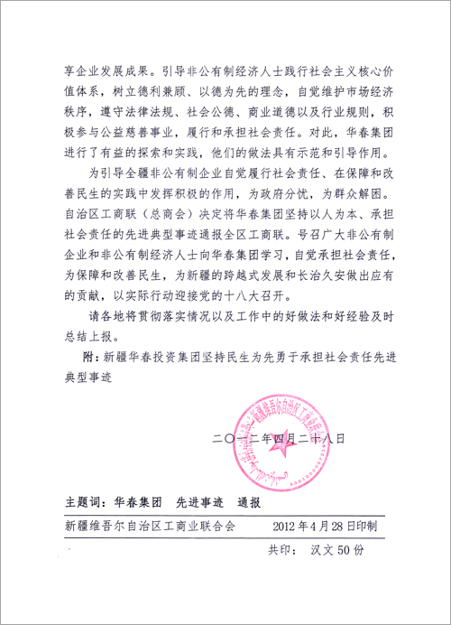 為引導(dǎo)全疆非公有制企業(yè)自覺履行社會責(zé)任,在保障和改善民生的實踐中發(fā)揮積極的作用,為政府分憂,為群眾解困。自治區(qū)工商聯(lián)(總商會)決定將華春投資集團(tuán)堅持民生為先勇于承擔(dān)社會責(zé)任先進(jìn)典型事跡通報全區(qū)工商聯(lián)。號召廣大非公有制企業(yè)和非公有制經(jīng)濟(jì)人士向華春投資集團(tuán)學(xué)習(xí),自覺承擔(dān)社會責(zé)任,為保障和改善民生,為新疆的跨越式發(fā)展和長治久安做出應(yīng)有的貢獻(xiàn),以實際行動迎接黨的十八大召開。