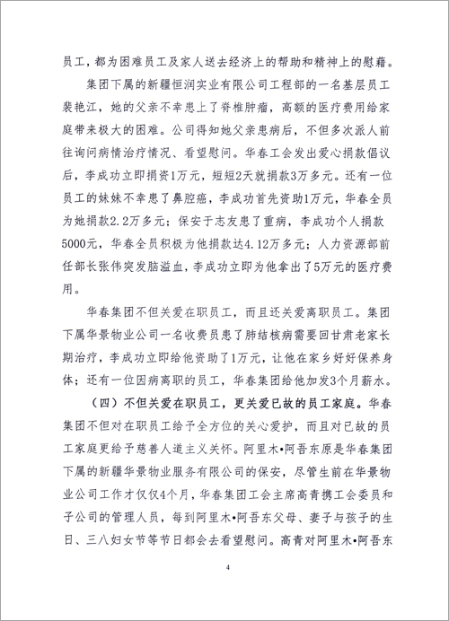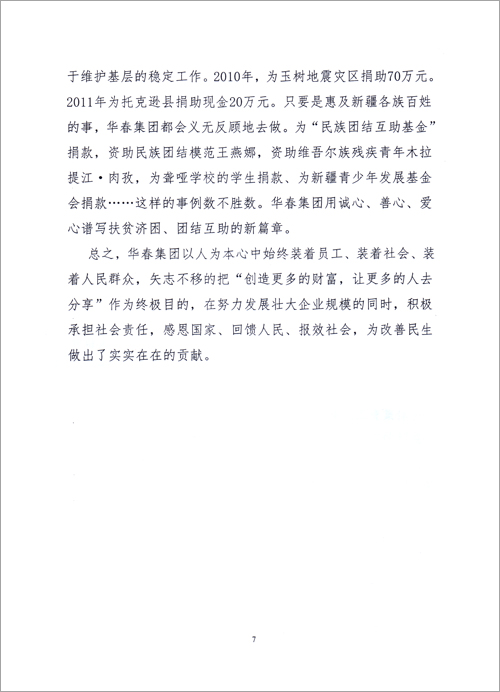 華春投資集團(tuán)成立17年來,作為一個有社會責(zé)任感的民營企業(yè),華春投資集團(tuán)履行責(zé)任,積極參與公益事業(yè),反哺社會,感恩各界,是新疆首家參與社會主義新農(nóng)村建設(shè)的民企;是全疆向社會各界贈送價值高達(dá)幾十萬元的黨報、提供精神食糧的企業(yè);是全國首家資助第八屆全國民運(yùn)會新疆代表團(tuán)的民企;華春投資集團(tuán)是全疆對員工從獎勵住房到組織旅游、從子女上學(xué)到父母養(yǎng)老等40多項福利形成制度化的民營企業(yè)……