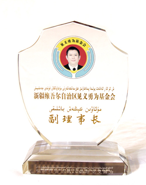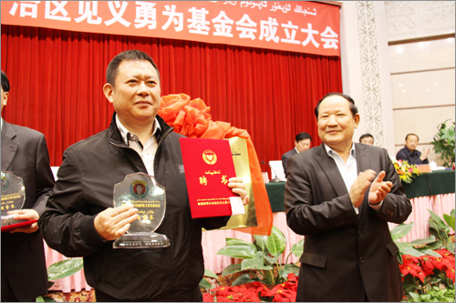 自治區(qū)見義勇為基金會成立大會于2012年10月19日上午在自治區(qū)人民大會堂多功能廳隆重舉行,新疆華春投資集團董事局主席兼總裁李成功先生當選自治區(qū)見義勇為基金會首屆理事會副理事長,自治區(qū)副主席、黨委政法委副書記賈帕爾•阿比布拉為李總裁頒發(fā)了副理事長證書和座牌。