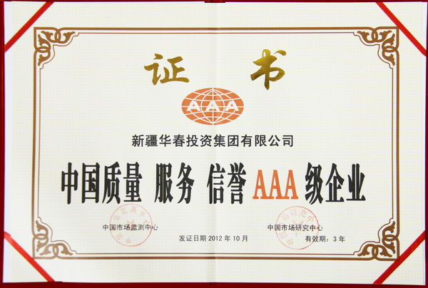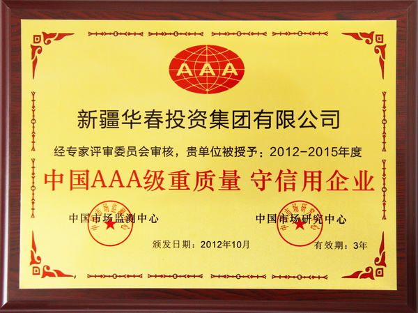 2012年12月,經(jīng)中國市場(chǎng)監(jiān)測(cè)中心、中國市場(chǎng)研究中心對(duì)新疆華春投資集團(tuán)進(jìn)行綜合考證和量化分析,華春投資集團(tuán)榮膺“中國AAA級(jí)重質(zhì)量守信用企業(yè)”、“中國質(zhì)量 服務(wù) 信譽(yù)AAA級(jí)企業(yè)”、“中國質(zhì)量 服務(wù) 信譽(yù)AAA級(jí)品牌”榮譽(yù)稱號(hào),頒發(fā)了榮譽(yù)證書和獎(jiǎng)牌。