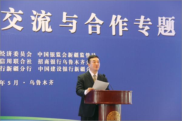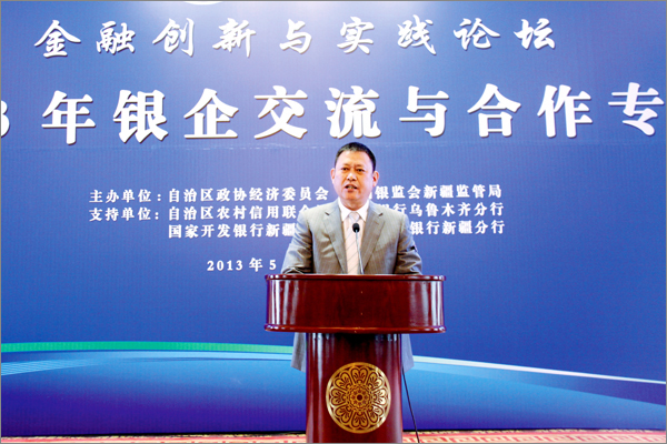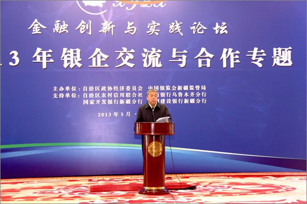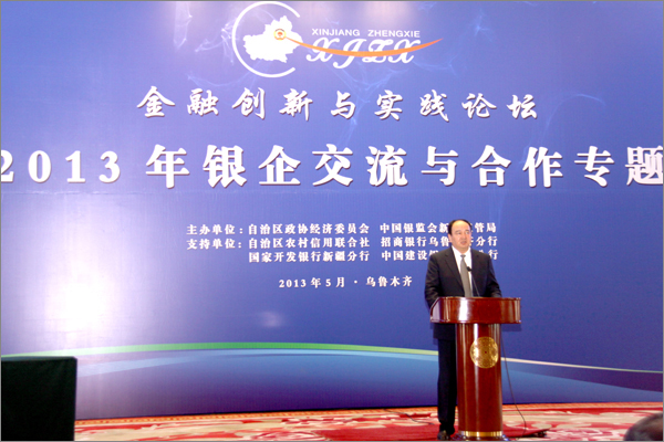 由自治區(qū)政協(xié)、中國銀監(jiān)會新疆監(jiān)管局主辦的首屆新疆金融創(chuàng)新與實踐論壇——2013年銀企交流與合作專題于5月10日在烏魯木齊昆侖賓館隆重開幕。自治區(qū)政協(xié)主席努爾蘭•阿不都滿金出席論壇并致辭,自治區(qū)副主席錢智作重要講話。自治區(qū)人大、政府、政協(xié)等領導出席論壇開幕。自治區(qū)和兵團學者、金融專家、新疆境內(nèi)多家商業(yè)銀行、非銀行金融機構(gòu)代表,中小微企業(yè)、商會負責人等400余人齊聚一堂,20位來自政府相關(guān)部門、金融監(jiān)管和金融機構(gòu)、小微企業(yè)和非銀行金融機構(gòu)的人士作了專題發(fā)言。新疆華春集團李成功總裁、常青副總裁2位代表做精彩演講。