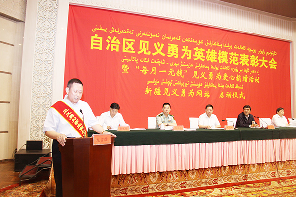 李成功總裁代表為自治區(qū)見(jiàn)義勇為事業(yè)作出突出貢獻(xiàn)的模范單位和個(gè)人在表彰大會(huì)上發(fā)言。他懷著感恩之情說(shuō):“我們只是做了一點(diǎn)力所能及的事,自治區(qū)人民政府給予了我們這么高的榮譽(yù),民營(yíng)企業(yè)的發(fā)展,得益于黨的好政策、得益于和諧安定的社會(huì)環(huán)境。而正是這些見(jiàn)義勇為的英雄們,為今天和諧安定的社會(huì),獻(xiàn)出了他們的鮮血和生命,使我們企業(yè)有了優(yōu)美的發(fā)展環(huán)境,飲水思源,我們要把對(duì)見(jiàn)義勇為英雄們的敬仰之情,轉(zhuǎn)化為弘揚(yáng)正氣、凝聚正能量、構(gòu)建和諧社會(huì)的強(qiáng)大動(dòng)力。企業(yè)要積極參與支持見(jiàn)義勇為事業(yè)、并回報(bào)社會(huì),這是所有民營(yíng)企業(yè)家義不容辭的社會(huì)責(zé)任!希望有更多的民營(yíng)企業(yè)家和社會(huì)有識(shí)之士,以勇于擔(dān)當(dāng)?shù)臅r(shí)代精神,積極投身于見(jiàn)義勇為事業(yè),慷慨解囊,用實(shí)際行動(dòng)真誠(chéng)關(guān)心、愛(ài)護(hù)見(jiàn)義勇為者,決不讓為社會(huì)安定、人民幸福而流血的見(jiàn)義勇為英雄們流血又流淚、傷身又傷心。形成全社會(huì)都來(lái)關(guān)心、支持見(jiàn)義勇為事業(yè)、弘揚(yáng)見(jiàn)義勇為精神的良好局面,為新疆的跨越式發(fā)展和長(zhǎng)治久安做出應(yīng)有的貢獻(xiàn)!讓我們攜起手來(lái),共同激發(fā)起全社會(huì)的正能量,弘揚(yáng)正氣,為正義之火添柴加薪!