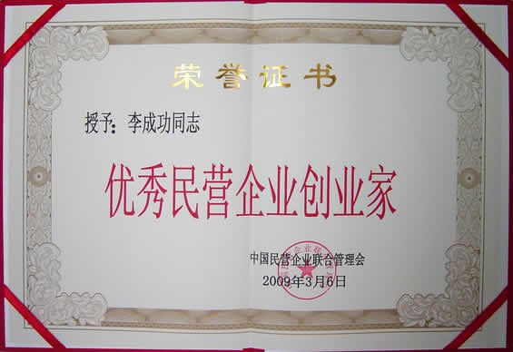 “優(yōu)秀民營企業(yè)創(chuàng)業(yè)家”榮譽證書