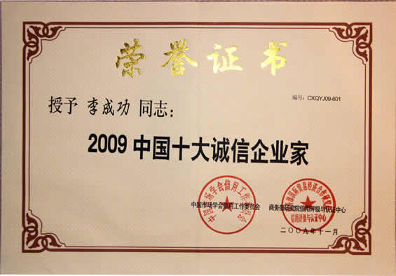 “2009中國(guó)十大誠(chéng)信企業(yè)家”榮譽(yù)證書(shū)
