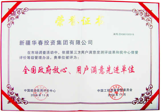 “全國政府放心、用戶滿意先進單位”榮譽證書