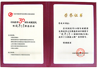旨在關注改革進程、展示改革成就、聚焦改革之星、弘揚改革業(yè)績,由中國改革報社、國務院國有資產監(jiān)督管理委員會研究中心、國家發(fā)展和改革委員會中國經貿導刊雜志社、人民日報社中國經濟周刊、經濟日報中國經濟信息雜志社及中國企業(yè)報社六家機構特聯合主辦的中國改革開放30周年成就巡禮暨改革之星頒獎典禮,于11月6日下午在莊嚴的北京人民大會堂隆重舉行。新疆華春投資集團董事局主席兼總裁李成功先生榮獲“改革之星——影響中國(行業(yè))改革十大創(chuàng)新人物”獎項。