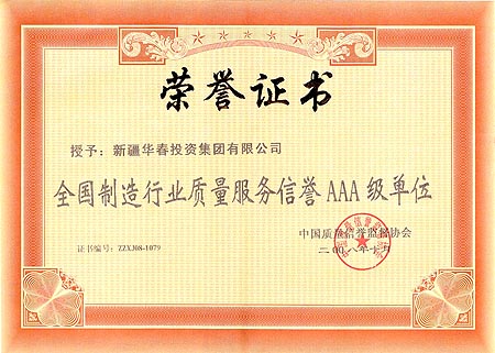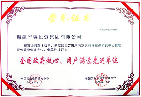 在不平凡的2008年即將逝去之時(shí),新疆華春投資集團(tuán)以其實(shí)際,贏得了相應(yīng)的眾多榮譽(yù):10月被中國(guó)質(zhì)量信譽(yù)監(jiān)督協(xié)會(huì)評(píng)為全國(guó)制造行業(yè)質(zhì)量服務(wù)信譽(yù)AAA級(jí)單位;11月被中國(guó)建設(shè)信用評(píng)價(jià)中心、中國(guó)工程質(zhì)量管理委員評(píng)為 “2008年(首批)全國(guó)建設(shè)信用誠(chéng)信企業(yè)”和“全國(guó)政府放心、用戶滿意先進(jìn)單位”,頒發(fā)了獎(jiǎng)牌和證書(證書編號(hào):Z0080100316)。